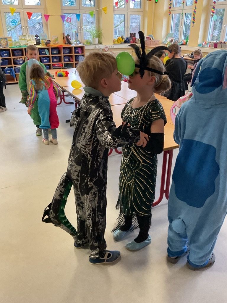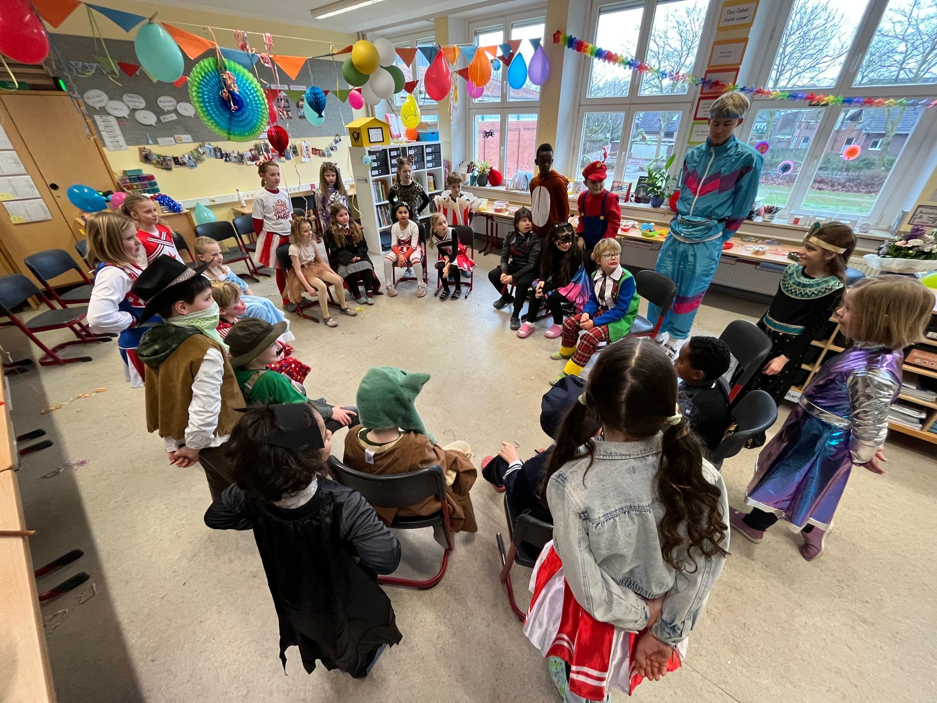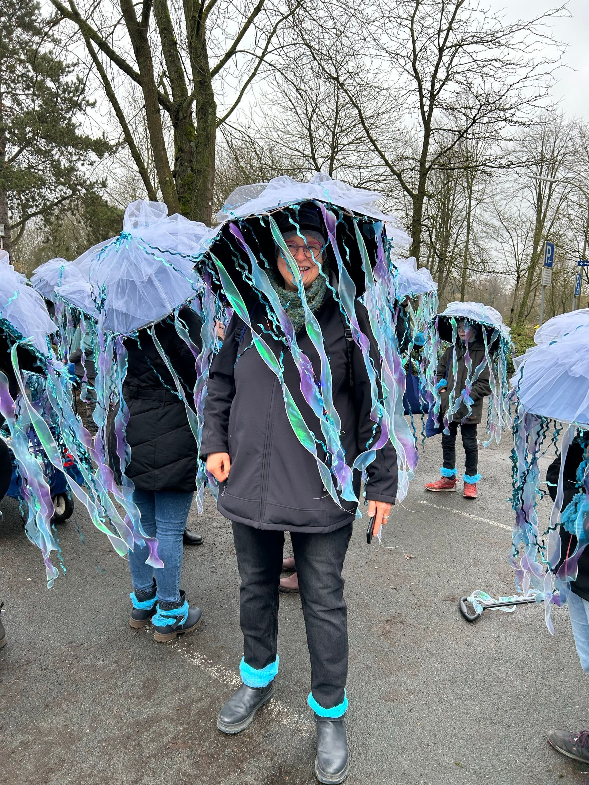 An Weiberfastnacht feierten 440 Kinder und alle Erwachsenen an der Ludgerischule ausgelassen Karneval. Zuerst wurden in den Klassen lustige Spiele gespielt und es wurde am ungesunden Buffett genascht. Nach einer Polonaise durch die gesamte Schule stellten sich die Klassen am Straßenrand auf, um den bunten Karnevalsumzug anzuschauen. Eltern und Kinder der Klasse 4A nahmen als Berkelquallen aktiv am Umzug teil und wurden dabei von ihren Lehrerinnen Frau Ilge und Frau Stengel begleitet.