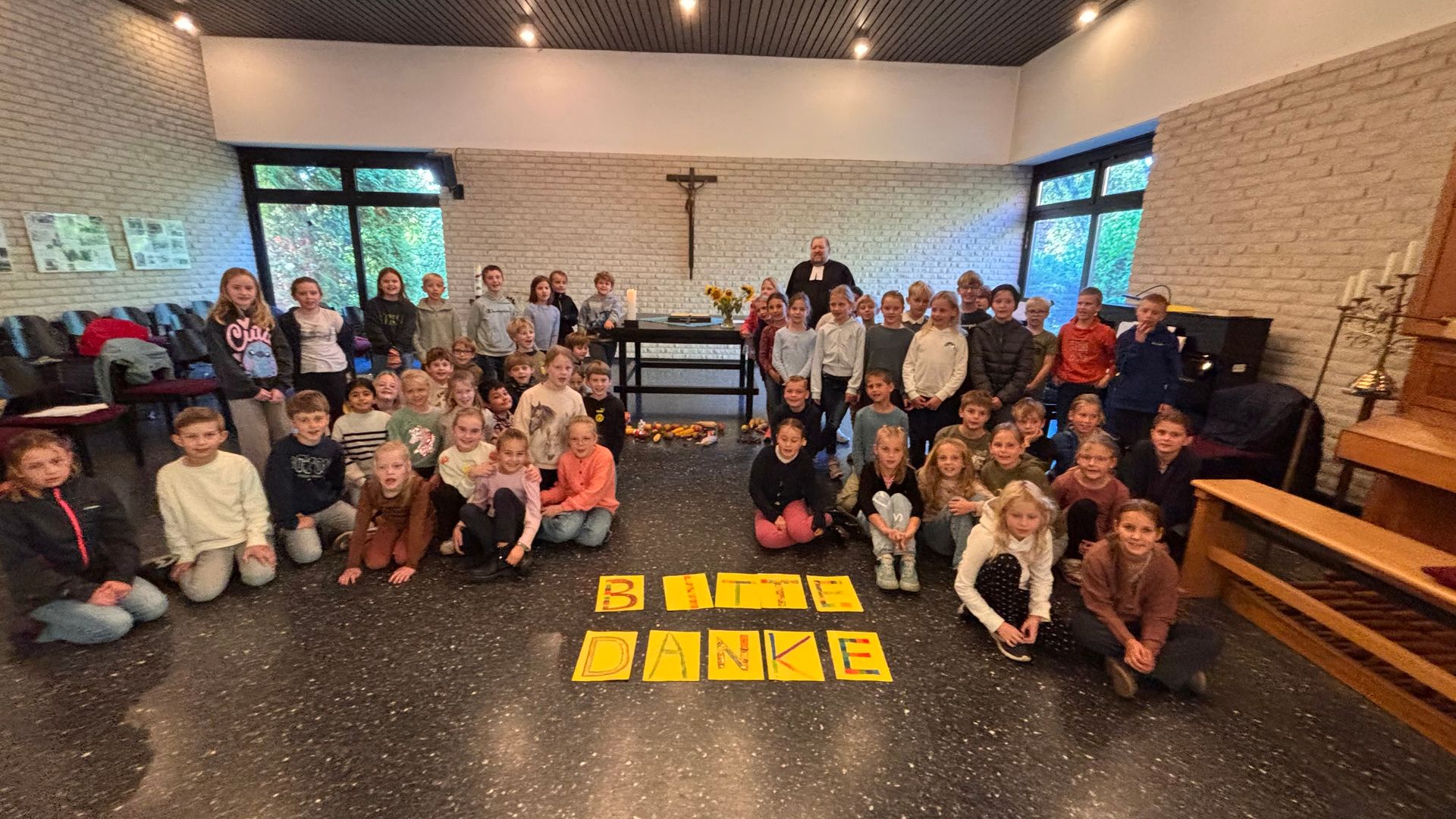Am 1. Oktober feierten die dritten Klassen einen Wortgottesdienst zum Thema Erntedank im evangelischen Kirchen-zentrum. DANKE und BITTE standen im Mittelpunkt des Gottesdienstes, den Pfarrer Ring zusammen mit der Organistin gestaltete. Die Kinder hatten Erntegaben vor den Altar gelegt und machten so sehr anschaulich deutlich, wie gut es uns geht, weil wir genug zum Essen haben.
