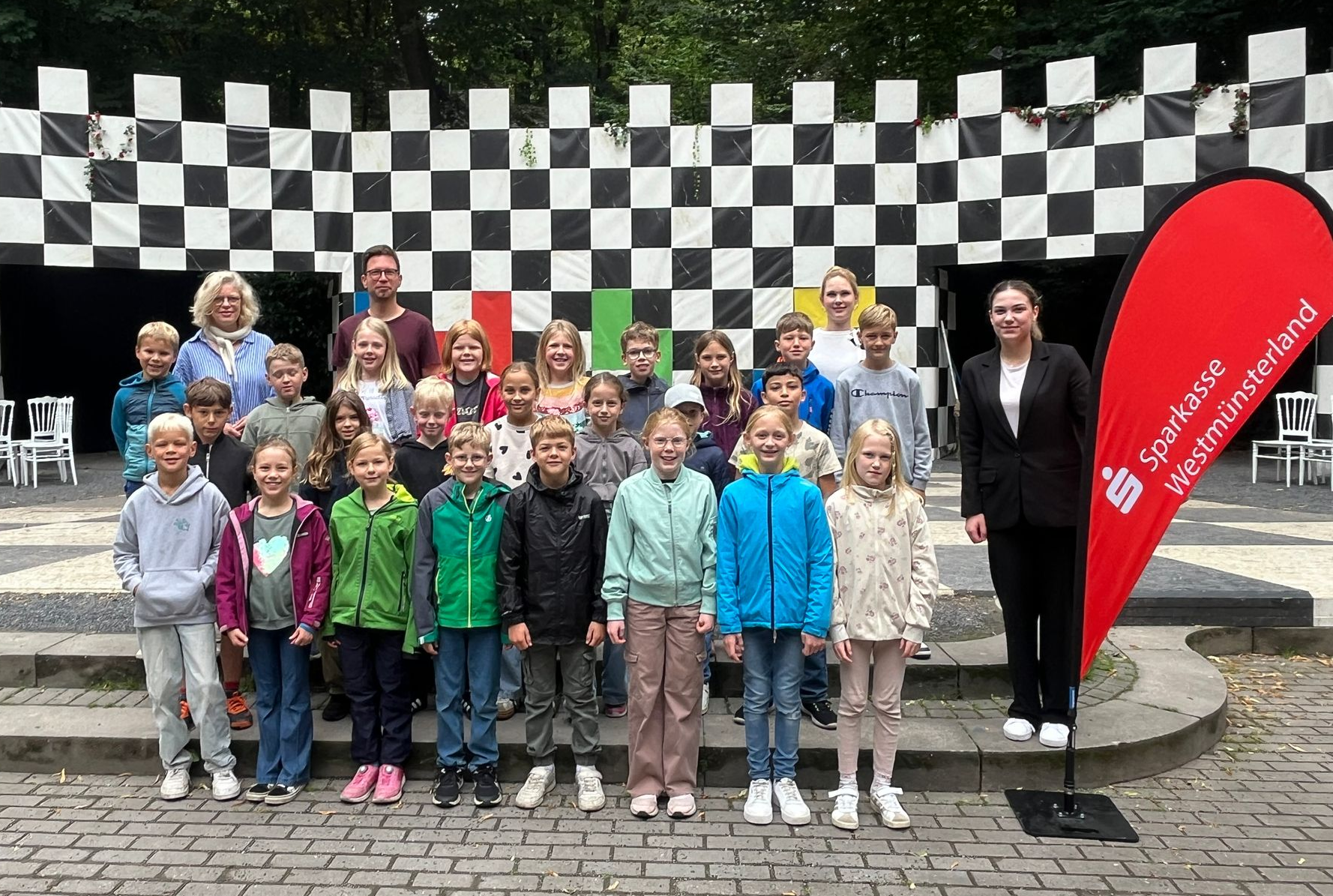 Als zuverlässiger Partner unterstützte die Sparkasse Westmünsterland wie in jedem Jahr den Besuch der Aufführung mit 1 € pro Kind. Rafaella Gousio von der Sparkasse Westmünsterland freute sich mit den begeisterten Kindern – hier mit Klasse 3D und den Lehrkräften Anke Artmann, Andreas Mollenhauer und Inga Tenkamp - und über viele strahlende Kinderaugen!
