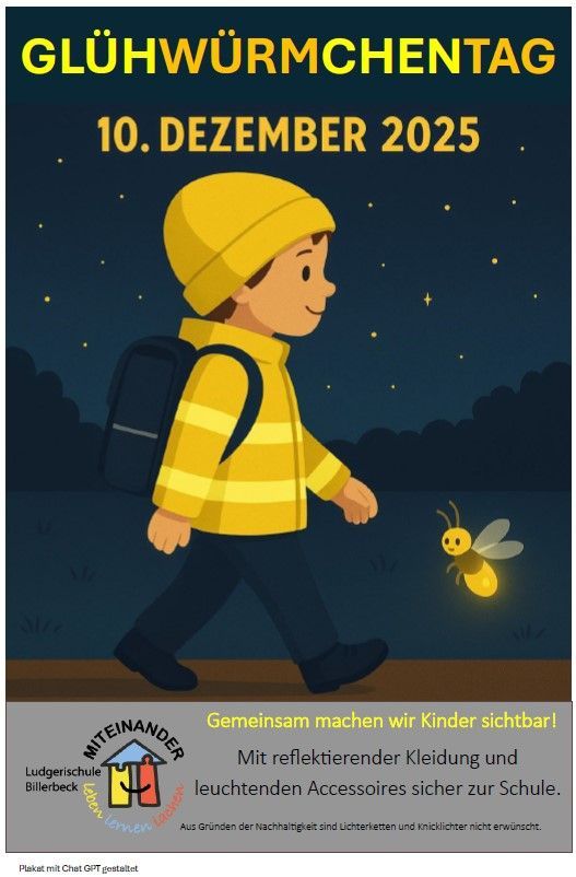 Erstmalig möchten wir am 10.12.25 einen sogenannten „Glühwürmchentag“ an unserer Schule durchführen und so zum dritten Mal in diesem Schuljahr auf die Notwendigkeit der guten Sichtbarkeit im Straßenverkehr hinweisen.